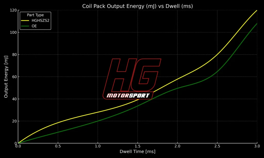 - 3,0 ms‘de HG-Motorsport bobinleri yaklaşık %25 daha fazla enerji sağlar.